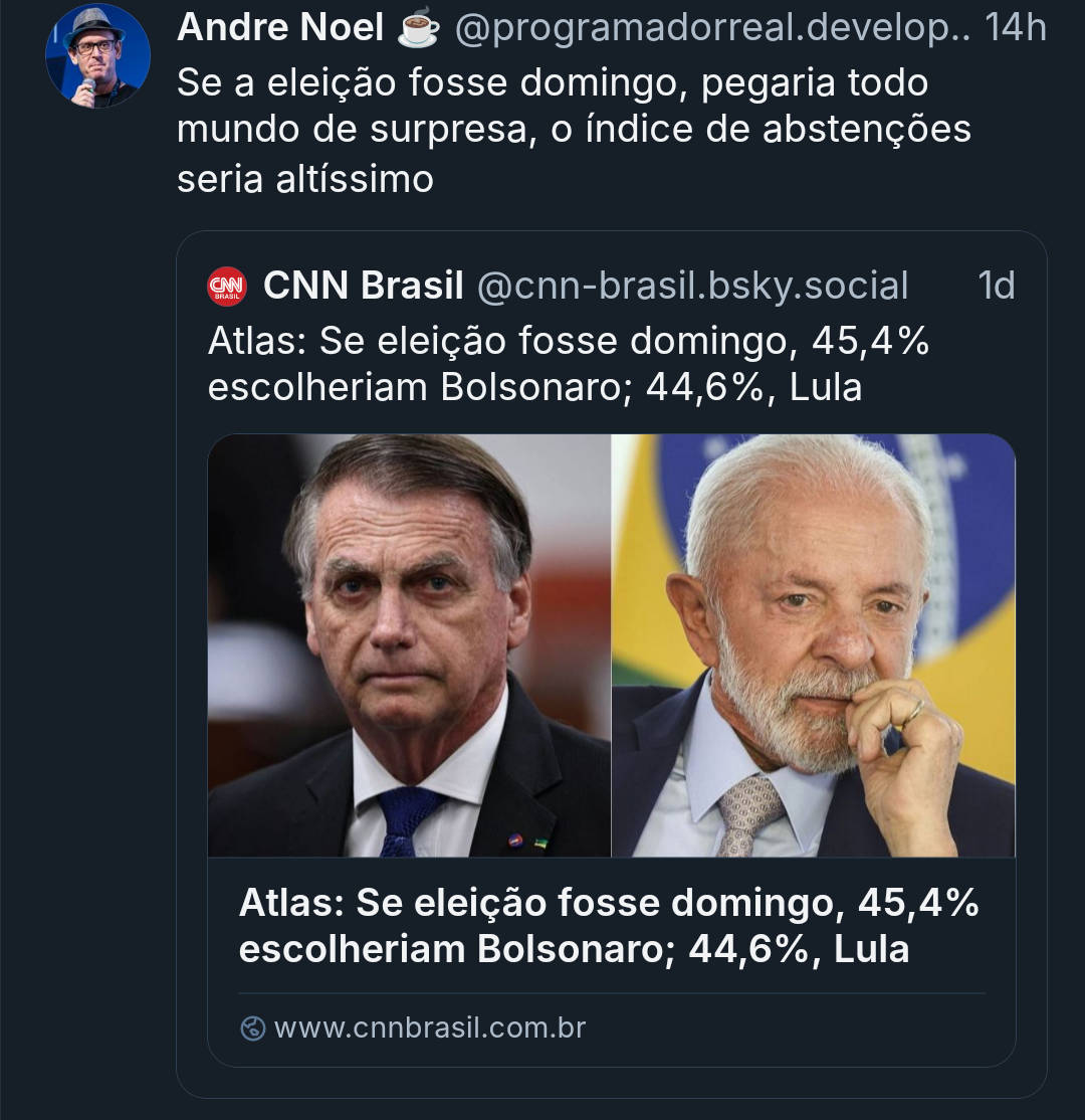 Postagem da CNN mostrando pesquisa Atlas que coloca o Bolsonaro em ligeira vantagem sobre o Lula caso a eleição fosse no domingo. André Noel comenta: "se a eleição fosse domingo, pegaria todo mundo de surpresa, o indice de abstenções seria altíssimo".